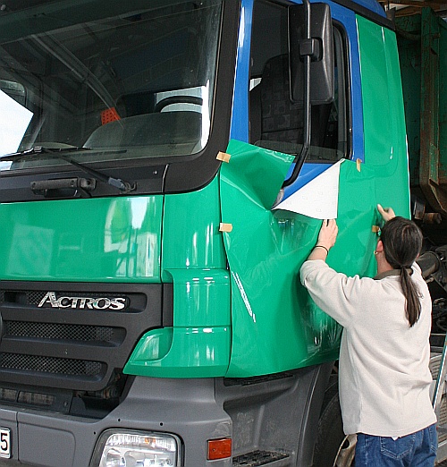 Das Fahrerhaus des LKW wird mit Hochleistungsfolie umgefärbt.
