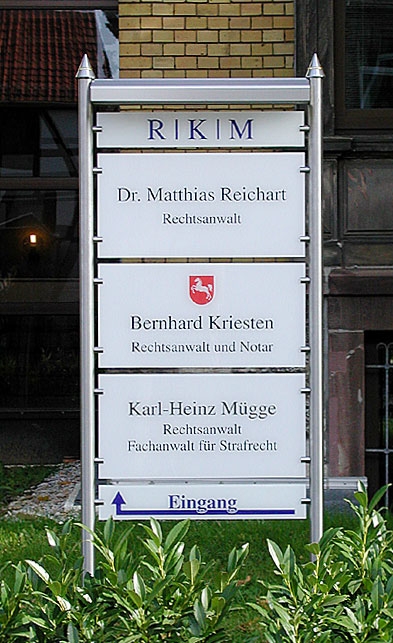 Ein Edelstahl-Schilderständer mit Acrylglastafeln für eine Anwaltskanzlei - in moderner Optik bewußt kontrastreich zum Villenstil des Gebäudes gestaltet!